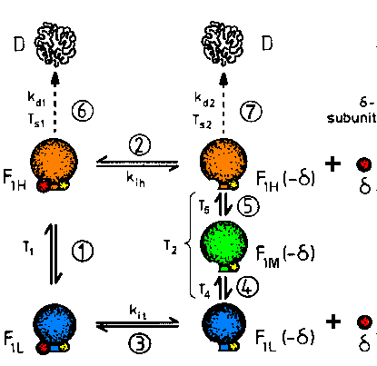 | Fig.1: The changes of structure and function of F1ATPase from Micrococcus luteus correspond to the dissociation of the inhibitory delta-subunit (reactions 2, 3), the reversible tempereature dependence (reactions 1, 4, 5) and to irreversible thermical denaturation (reactions 6, 7). Below the threshold temperatures Ts1 and Ts2 no significant denaturation is observed. This F1ATPase exists at lest in 5 enzymatically active modifications (conformations) (from T20, reference F8). |