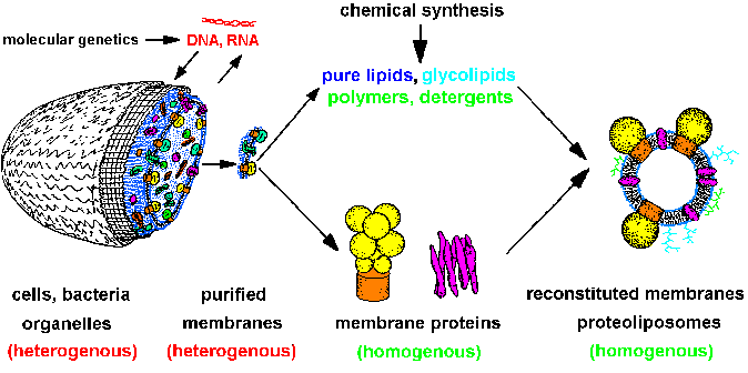 Fig.1: The strategy of biophysical chemistry of membranes and proteins leads from cells over isolated systems (proteins, lipids, membranes, nucleic acids) to reconstituted model membranes. Lipids, substrates (nucleotides) and compounds for the manipilation of the systems are accessible by chemical synthesis. At each level the systems are investigated by biochemistry, biophysics and structure investigation in parallel (after T20).