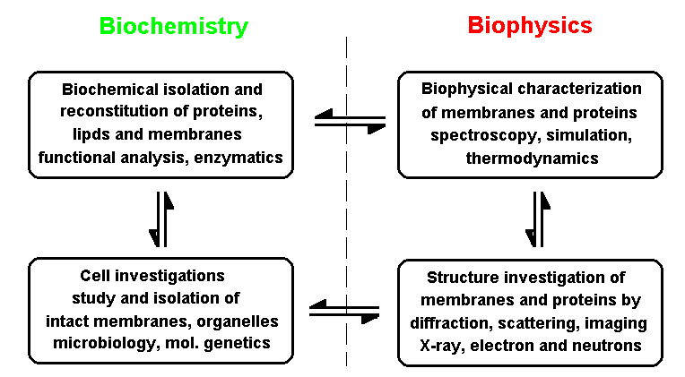 The study of biological systems requires the combination of complementary methods of structural biology, biochemistry, molecular genetics and biophysics in parallel (fig.2). This interdisciplinary concept of "life sciences" has to be applied in education and research. Due to the complex structure-function relation of biological systems, especially of membranes and multidomain proteins, a study with a single scientific method would result in a sketchy knowledge and misinterpretation. With limited resources (money, people, know how) this concept requires collaborations between scientific groups and institutions. In the structural biology field the MPSD group participates in a collaboration of several groups in the study group "Structure dynamics of flexible protein domains", which is an open scientific network.